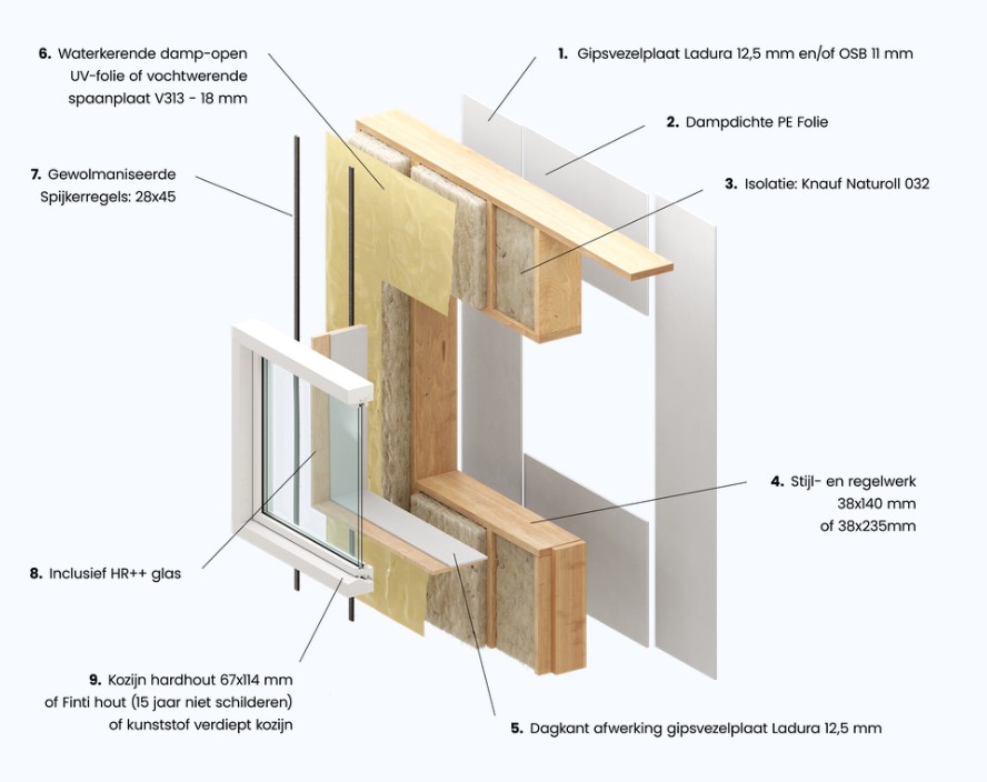 Technische samenvatting Houtskelet – Opbouw buitenmuur (binnen → buiten)